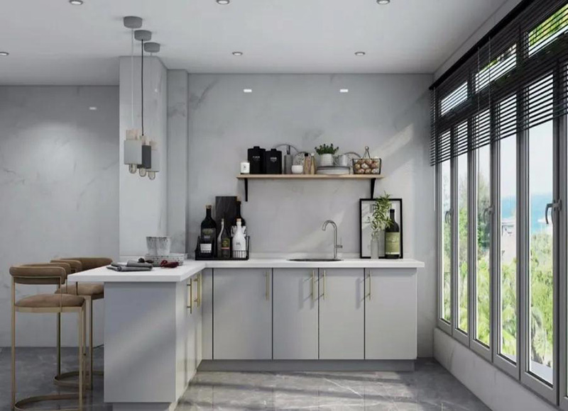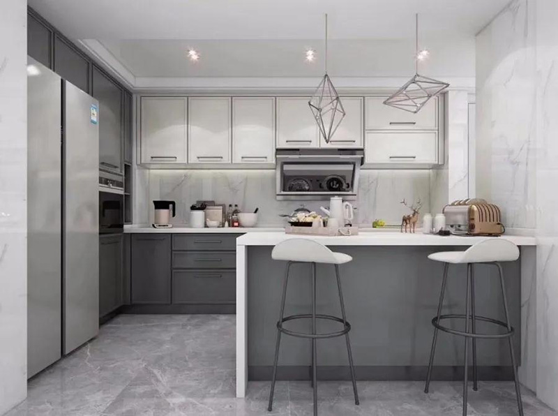 灰白調的法式廚房設計,增添一種簡單的純粹感。