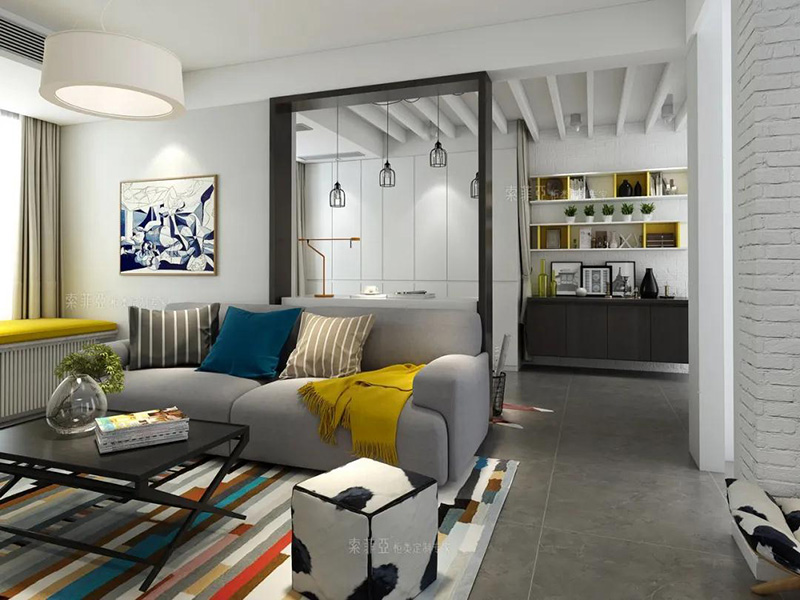 優點:沙發不靠墻擺放,軟隔斷出一個休閑區,打破了客廳布局的墨守成規,卡座、吧臺、吊椅、懶人沙發都可以在客廳里實現。