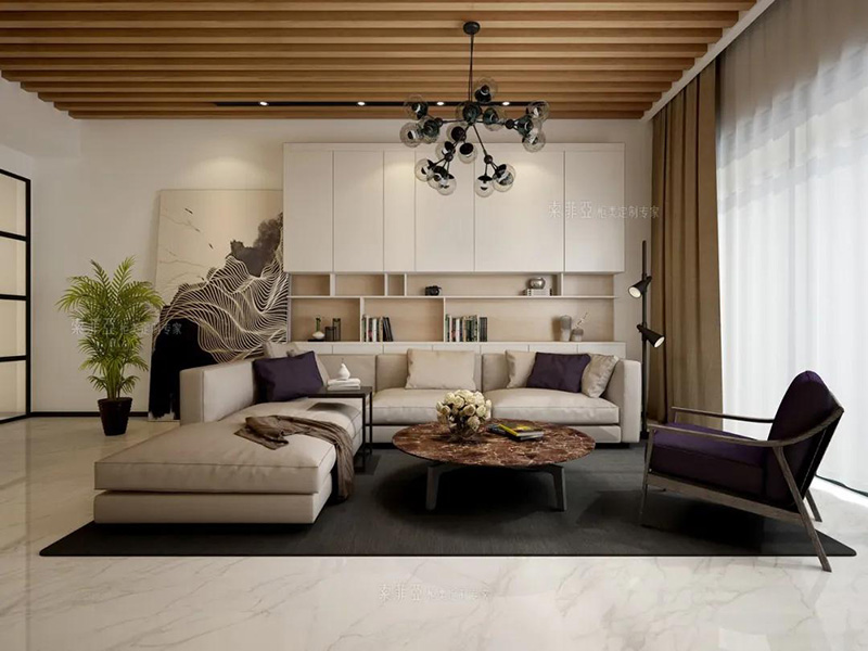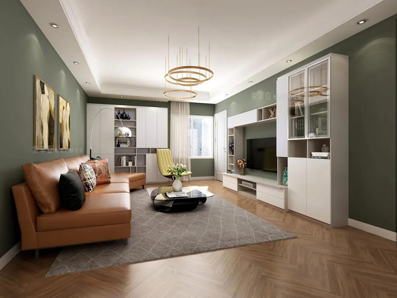 優點:沙發背靠成品櫃擺放,可以輔助收納的同時,還讓客廳更有層次感和空間感。且無需提前規劃,在客廳硬裝完成之后再操作也很方便。