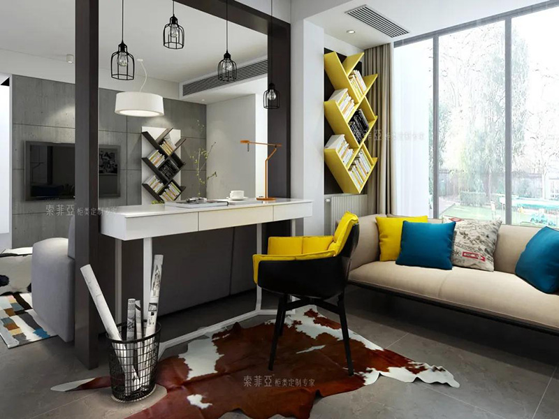 優點:將沙發前移,隔出空間形成開放式工作區。特別適合對書房有需求卻又沒有獨立空間造書房的朋友。