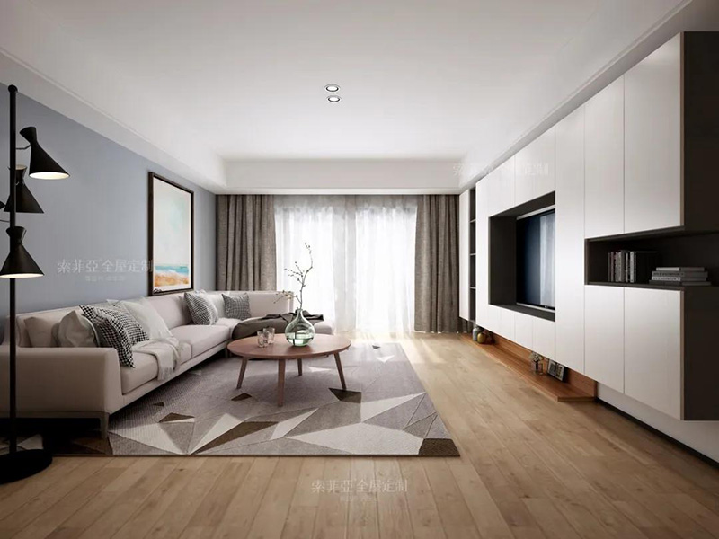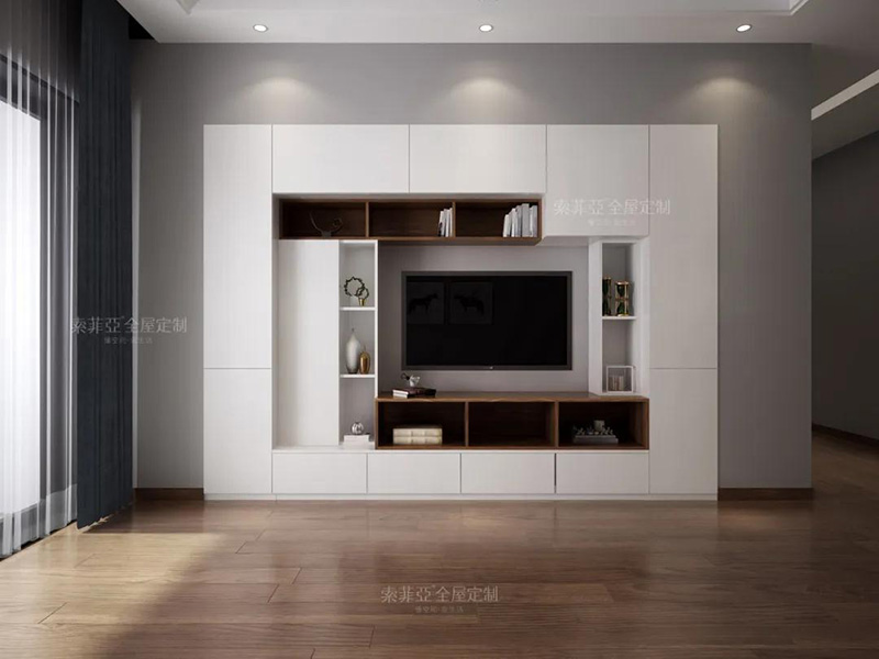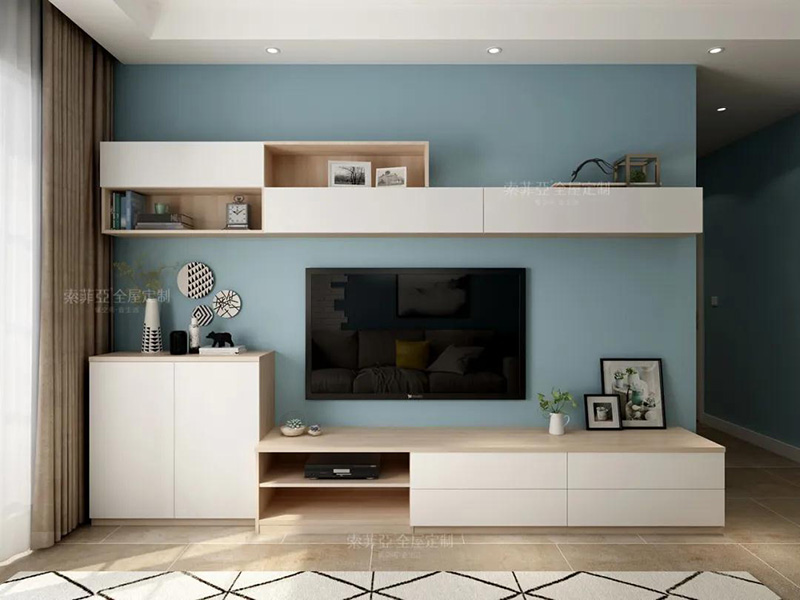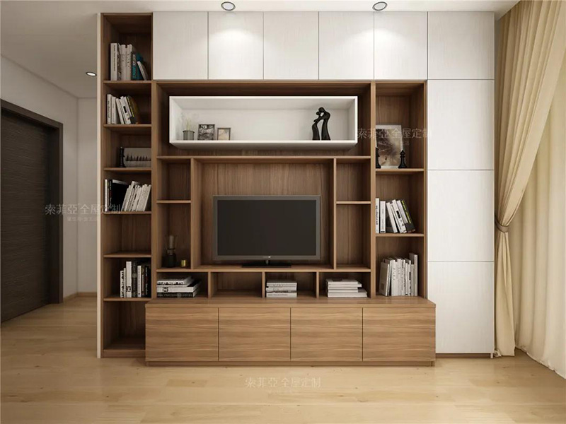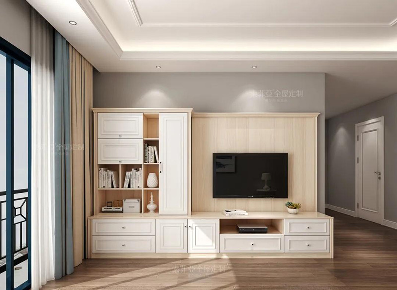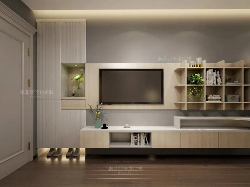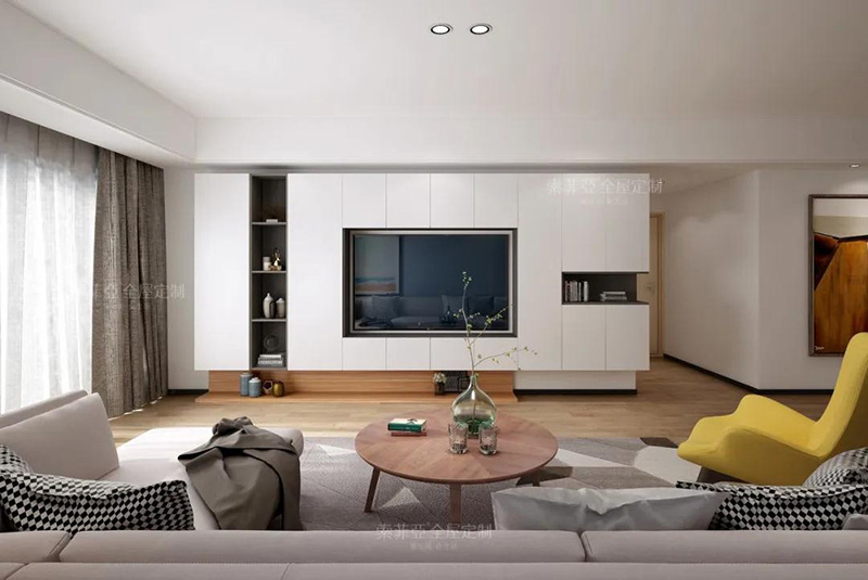 以電視為中心,客製化回型收納區。20%的區域做展示開放區,藏與露合理分配。完成干凈整潔,方能展露美。