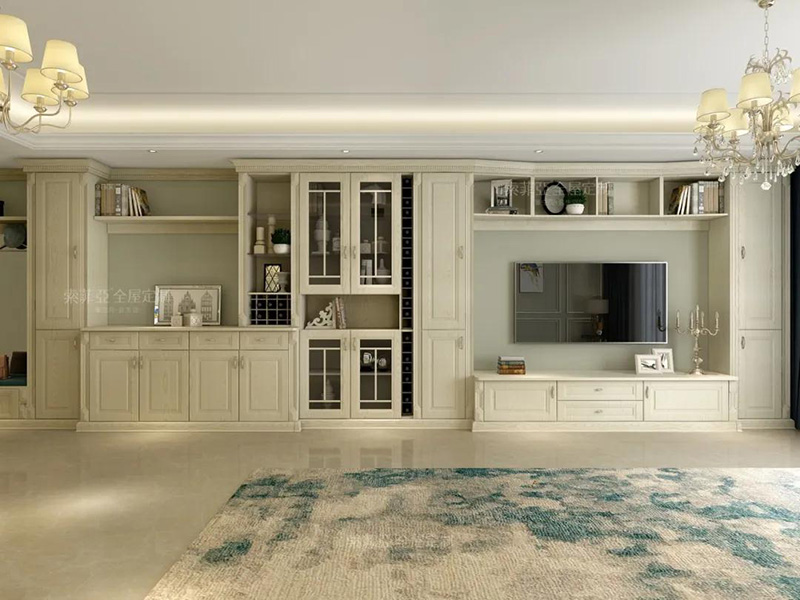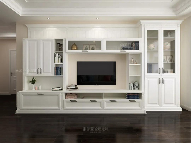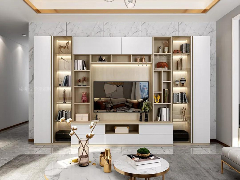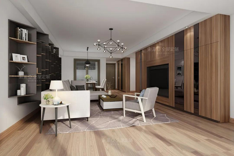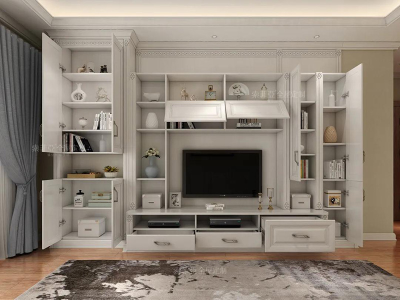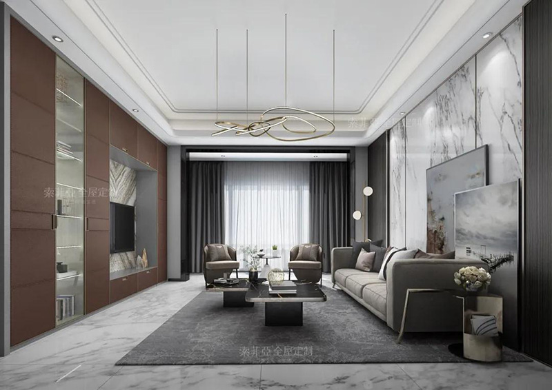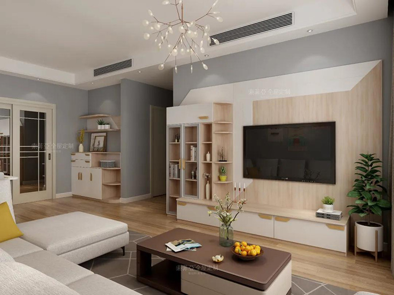 以電視為中心,客製化回型收納區。20%的區域做展示開放區,藏與露合理分配。完成干凈整潔,方能展露美。