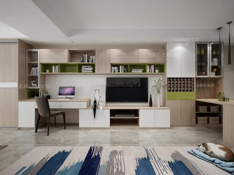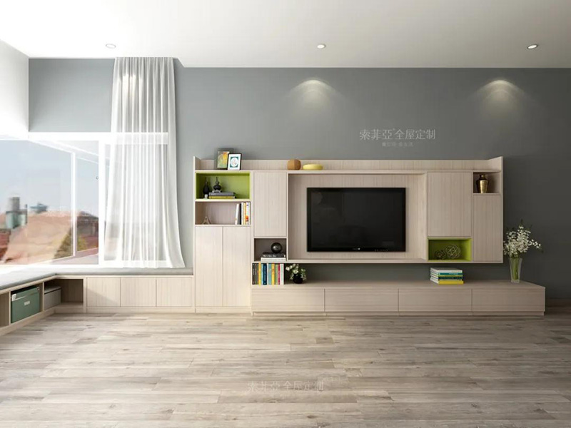 不想折騰背景墻顏色,搭配櫃體同款板材背景板,配色協調統一。