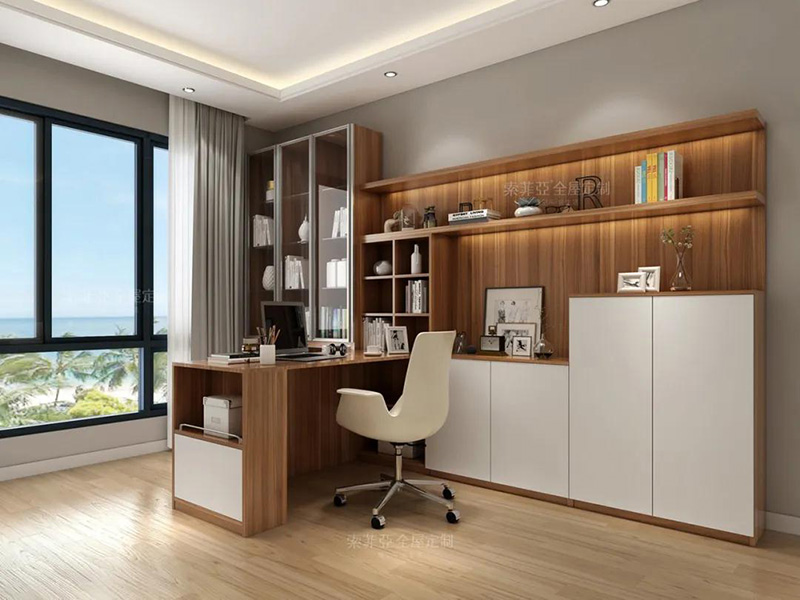 打通的陽臺並入客廳后,沿墻打造一體化書櫃+書桌,利用充足的光線實現一個客廳工作區~