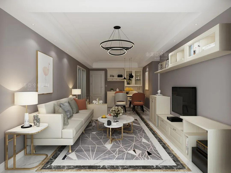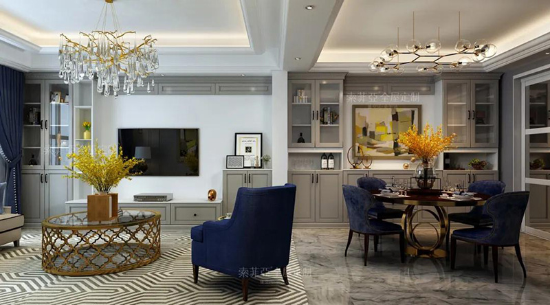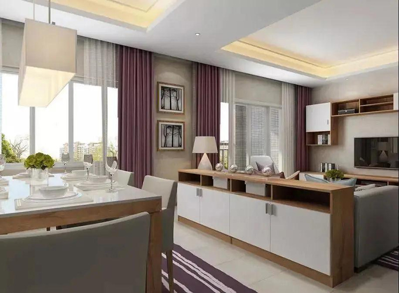 當然如果客廳縱深空間充足,還可以選擇沙發背櫃和餐邊櫃相連的設計,既區分了空間也能增加了收納。