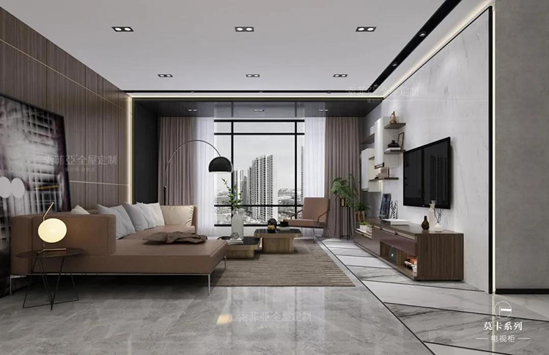 最常見的做法是,沙發沿墻體呈一字型擺開,與茶幾、電視櫃形成平行。