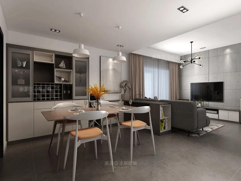 客餐廳相連的情況下,餐邊櫃和電視櫃一體設計,合理利用空間的同時,也能很好地兼顧到兩個空間的功能性。