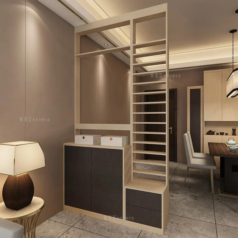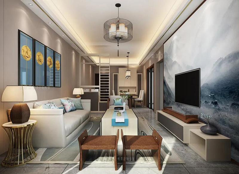 這套新中式客餐廳用木質屏風作為兩個空間的隔斷,屏風也是新中式風格中常用的家具,客餐廳間的過渡設計再次跟整體裝潢風格相聯系。同時,客餐廳兩個空間也使用了不同的燈具作為區分。
