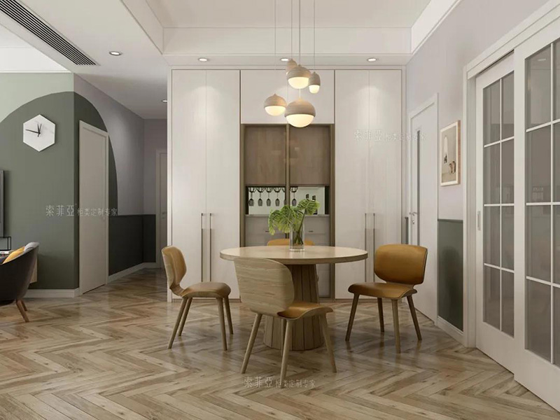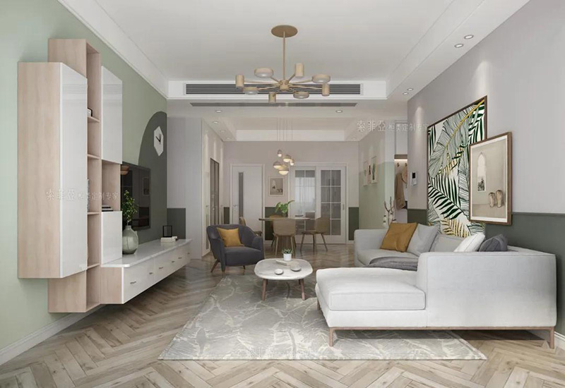 這套北歐風客餐廳案例是典型的開放式設計,開放式的客餐一體化格局很受歡迎,因為相連的空間讓視覺效果顯得開闊大氣,也更具有融通性,無拘無束,自由自在。