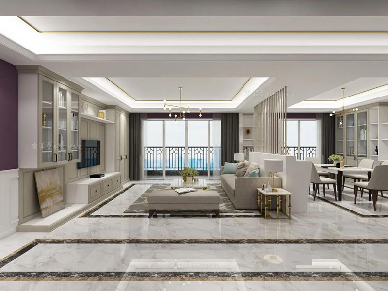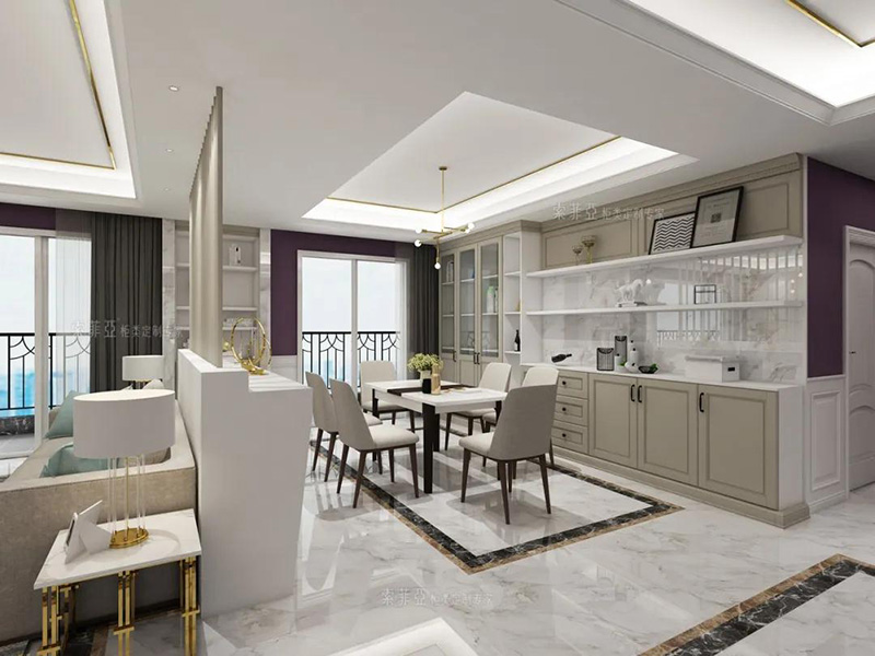 這套輕奢風客餐廳是屬于大橫廳型,所以客餐廳是連貫在一個空間的,采用的是緊貼著沙發的矮墻和裝飾橫條作為兩個空間的隔斷,這種過渡設計又豐富了空間層次又能增加觀賞性。