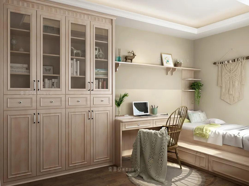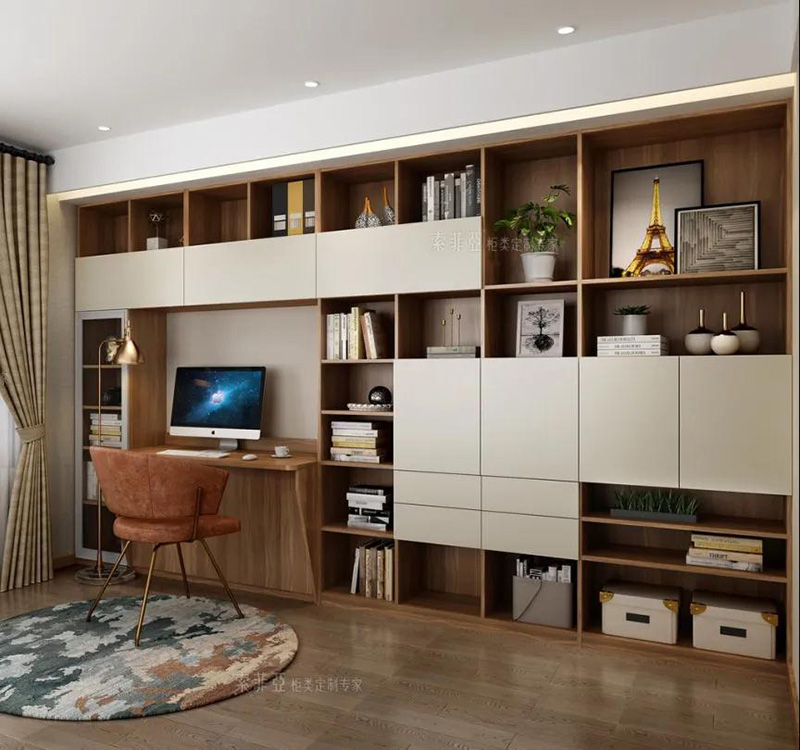 不過在書櫃的打造是有講究的。一般我們會選擇在書桌背后打造一個整墻的書櫃,大氣整潔又實用。