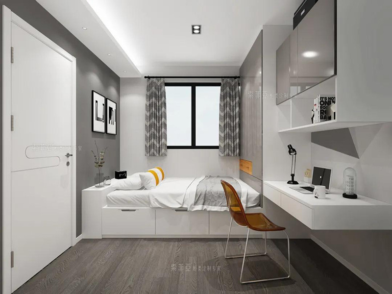 轉角工作區甚至還能和房間的其他家具結合在一起,讓臥室空間的設計更具整體感。