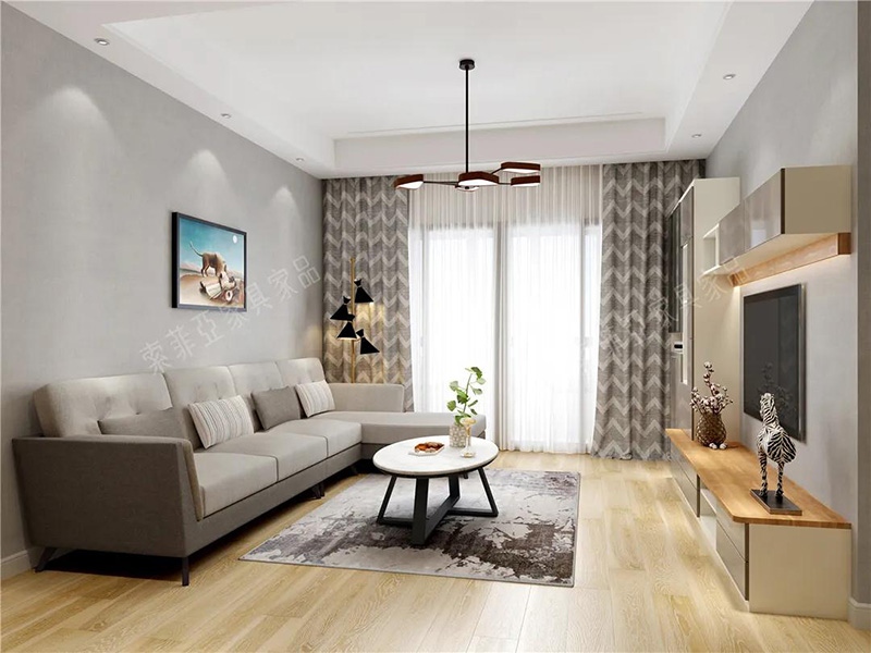四面落白的墻壁,平整的吊頂修飾,配上造型簡約且舒適的大沙發,就能詮釋現代設計的精髓,實用就好!