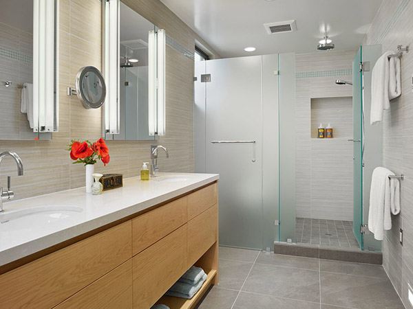 通常衛浴間都會比較濕潤,我們在設計的時候除了進行干濕分離以外,在裝潢時還要選擇品質優良的材料,防水是最根本的要求。此外,衛浴間的電路布置也要小心防水,避免產生漏電等情況。為了安全著想,衛浴間板磚最好使用防滑地磚,防止滑倒。個人建議,盡量不要選擇木質產品,比較容易生霉,大家可以采用瓷質、玻璃質的衛浴用品。