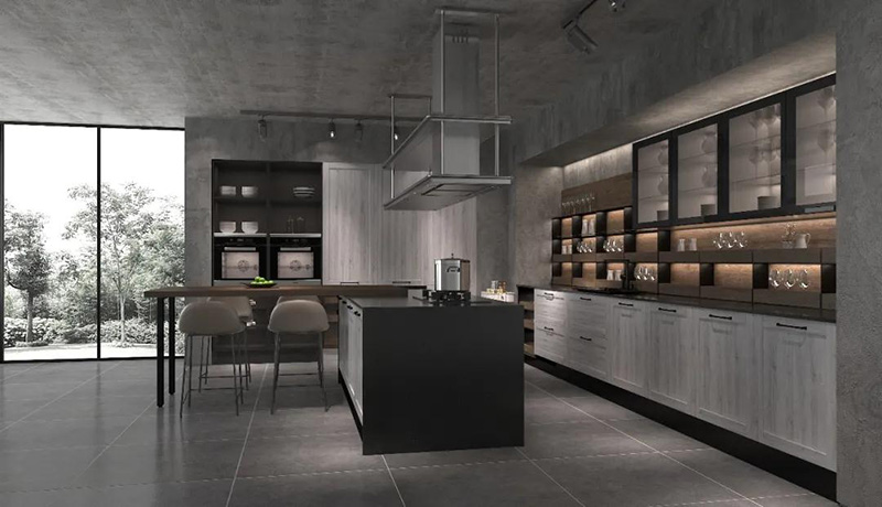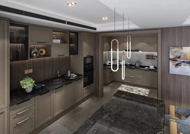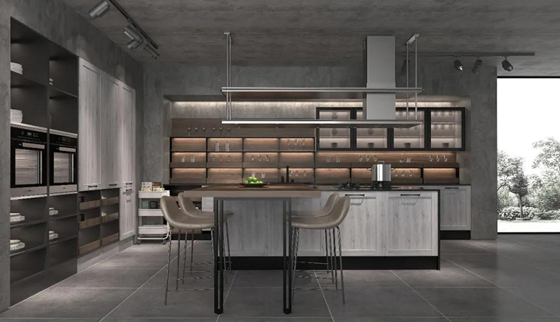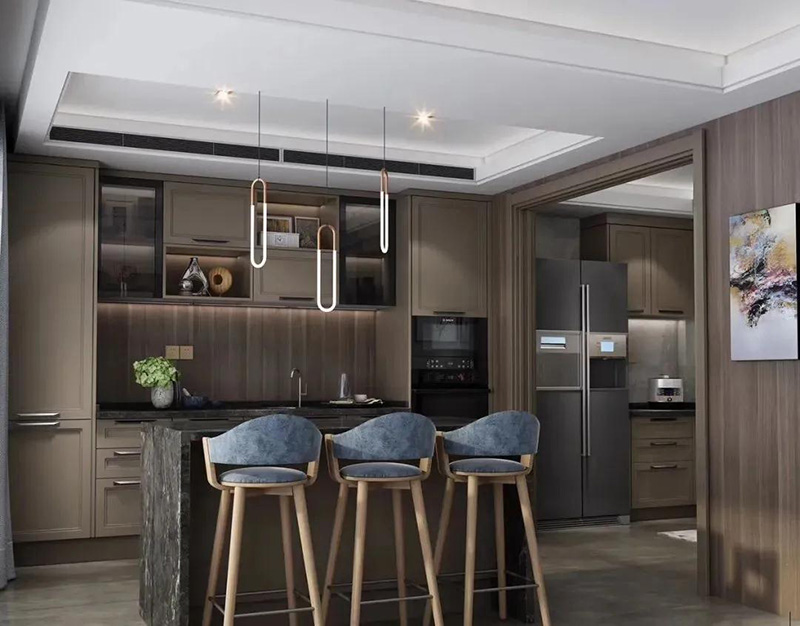 時尚大氣的開放式廚房空間,自然舒適的高級感,用自然肌理的木紋加上高級灰調營造一種自然而舒適的高級感覺,功能與美感共存,收納空間十分強大。