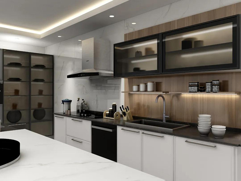 內嵌式廚電與精致的金屬拉手,讓廚房空間整體看起來舒適大氣,細節里充滿設計感。黑色的臺面與白色吊櫃形成鮮明對比,展現出時尚魅力。