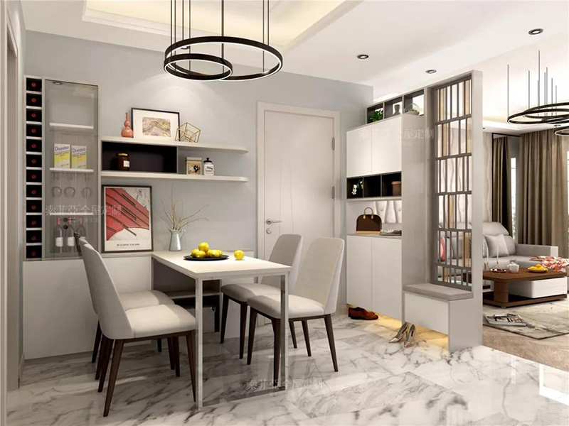 鞋櫃也能作為隔斷,在這個戶型中,入戶即是餐廳,所以用一面鞋櫃來做客餐廳之間的隔斷,雖然空間小,但井然有序,隱私保護得宜。
