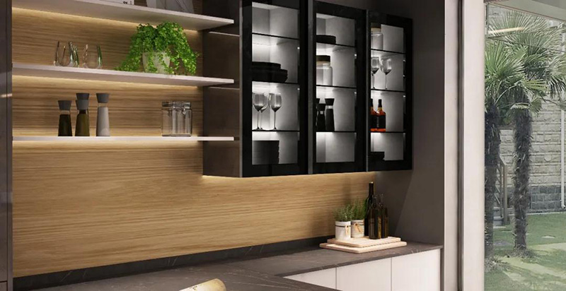 天然材質的肌理與紋路賦予廚房以經得起時間打磨的持久品質,層板燈與黑色鋁框玻璃門,通透精致,又不失奢雅氣質。
