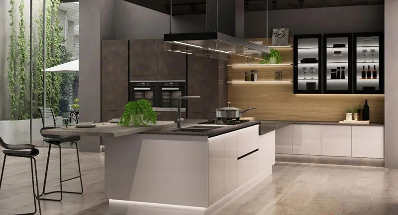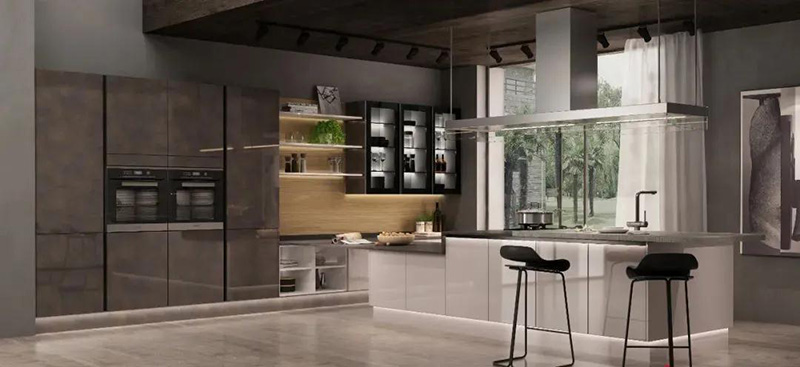 極光板具有極致高光澤度,在豐富巖石紋理飾面的映襯下,溫潤細膩的觸感與巖石肌理得以與高光充分融合,呈現出具有極光般絢麗通透高光效果,從外觀上提升了莫赫廚房空間的輕奢工業氣質。