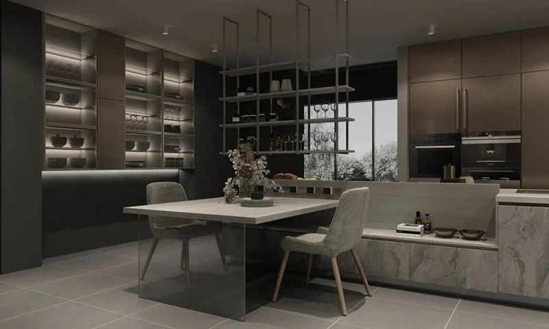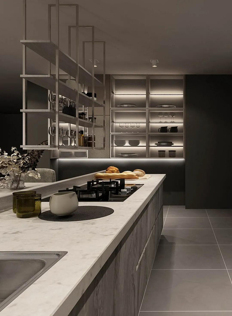 利用金屬餐具,吊燈、拉手等,能夠起到完美的裝飾效果,感受高品質浪漫,賦予廚房煥然一新的優雅魅力。