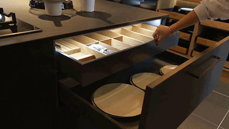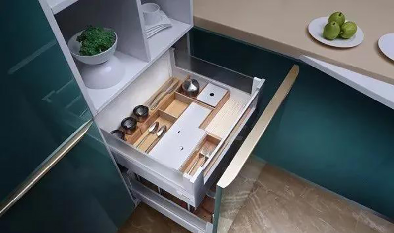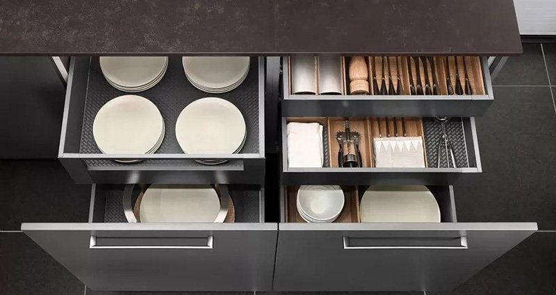 對于廚房里的抽屜可以根據具體需求客製化,為了避免拉抽屜有噪音可以考慮加防滑墊,既實用又容易打理。