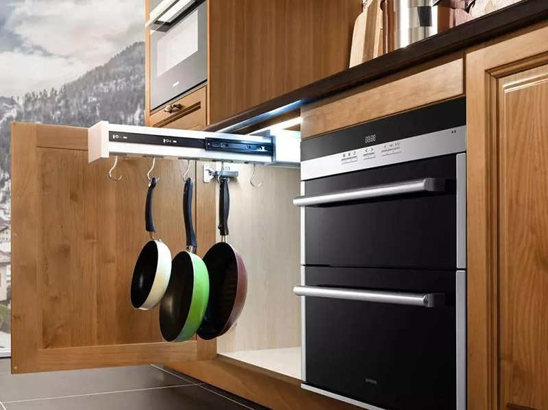 除此之外,可以在櫃子里面加裝導軌,方便于收納大型鍋具。
