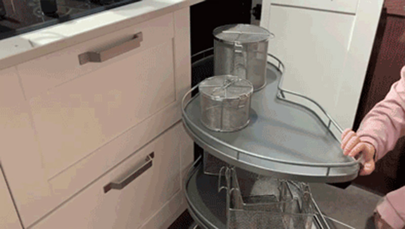 另外L型廚房地櫃轉角通常很深,取物品很不方便,可以設計轉角拉籃,只要輕輕一拉,想要的物品就能轉到自己眼前。找東西再也不會手忙腳亂。