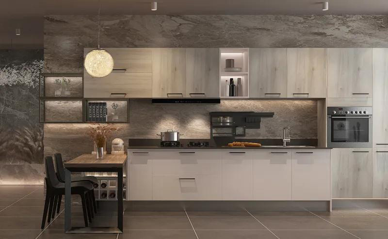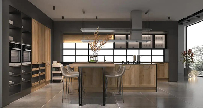 自然風廚房要想體現輕奢感,除了原木之外,還可搭配金屬、玻璃等元素,彰顯輕奢風的格調感。
