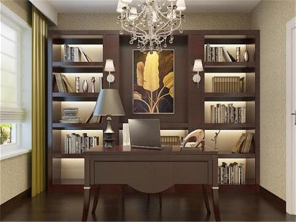 從圖中可看出,這款書架運用了對稱的手法,看上去十分的大方和雅致,中間的一副亮黃色的圖像也將整個書架的貴氣感展現得淋漓盡致,另外為了與書架相互呼應,書桌也運用了同種色系,營造出滿滿的書香氣息。
