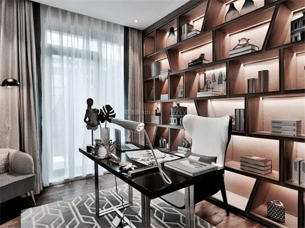 在窗口出設置書桌櫃是大部分用戶都十分常用的一種手法,既美觀又實用,並且能夠獲得充足的光線,從圖中可看出,簡單的書桌和個性的書架完美的連接在一起,同時還在榻榻米上設置了升降臺,不管是用來看書、會客,發呆都是很好的場所。