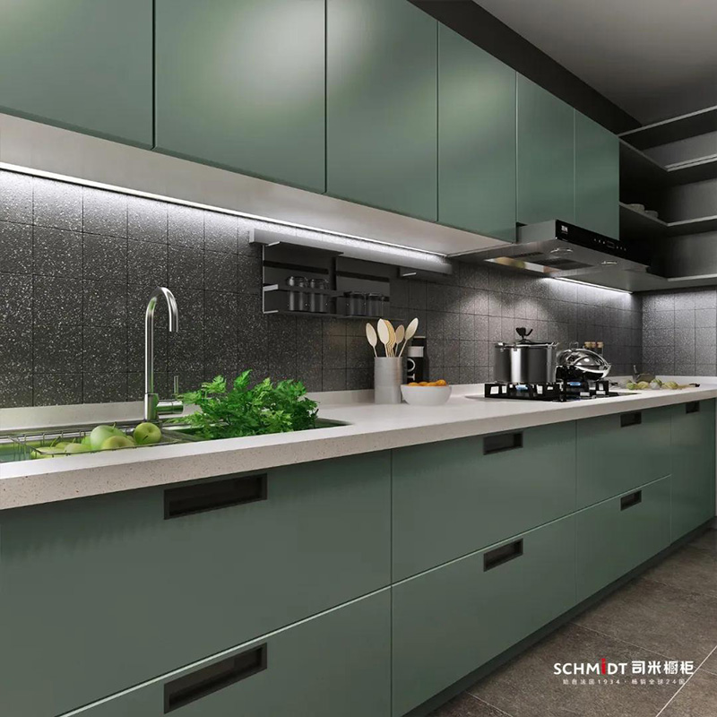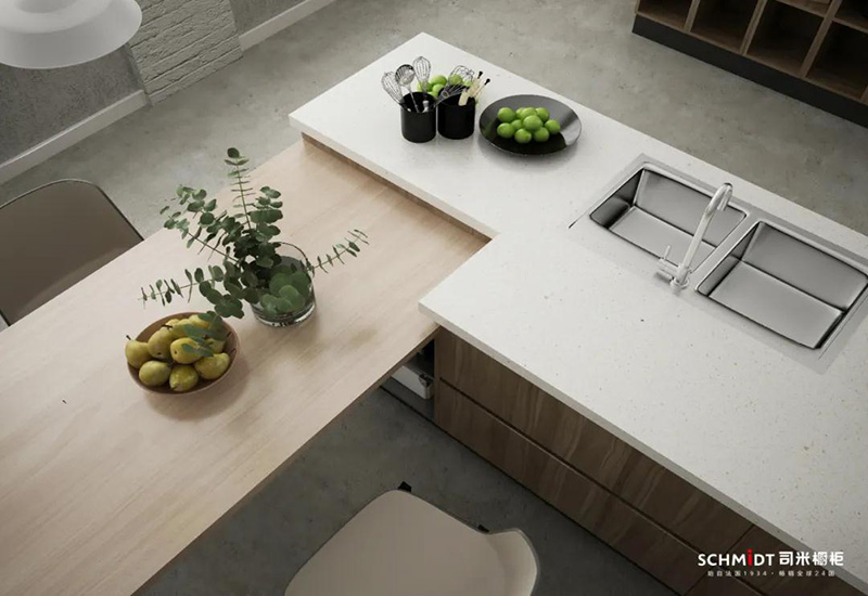 在現代廚房中,石英石臺面占據著主流。司米的石英石臺面,石英石含量達93%,硬度達到莫氏硬度6.5以上,用刀等尖銳物品磕碰,不怕劃傷;