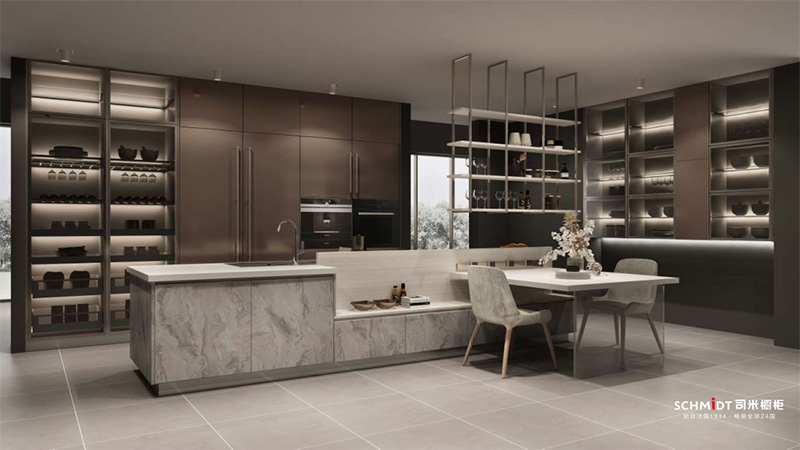 T型+獨立高櫃的設計,集顏值與收納于一身,極具設計感!餐具也可放在島臺里收納。