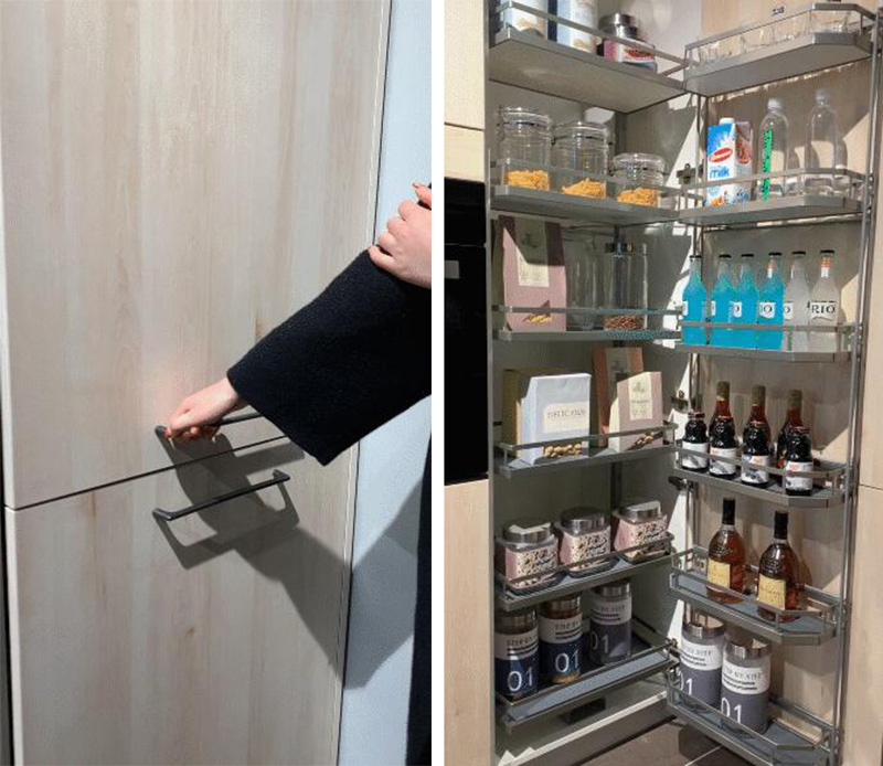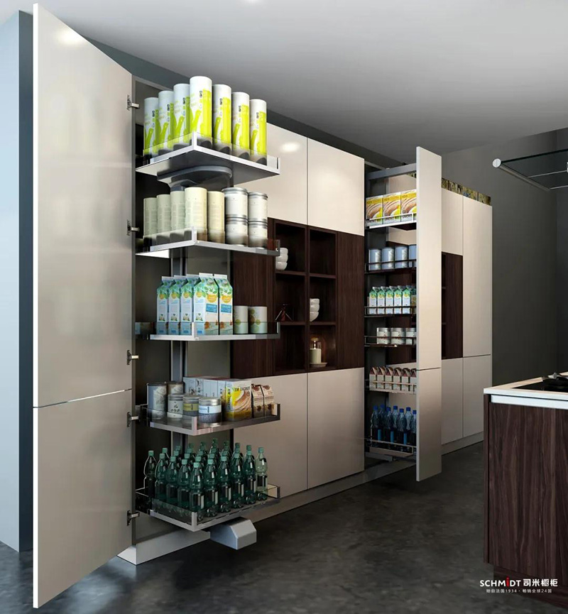 高櫃的收納能力本身就非常強,設計高櫃聯動五金拉籃,這樣高櫃就可以用來存放干貨、零食,以及一些瓶瓶罐罐。
