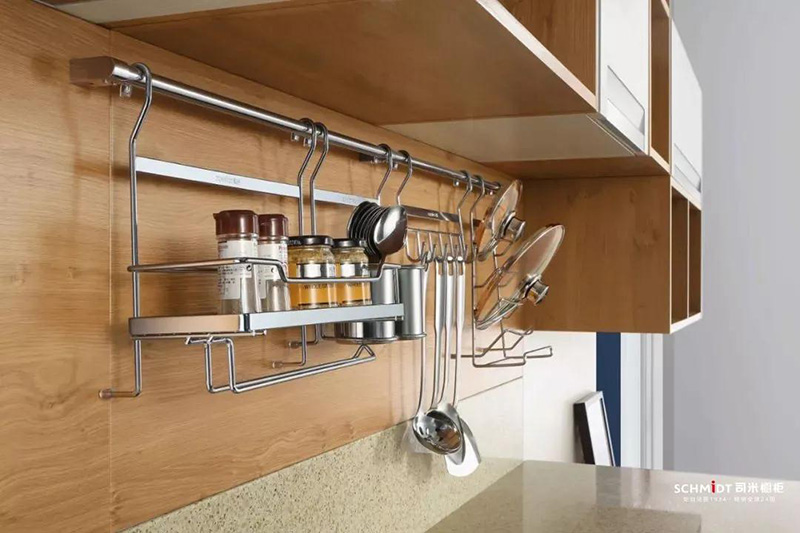 墻面掛件節省了臺面空間,不僅可以掛鍋勺、抹布,還可以擺放調料瓶。