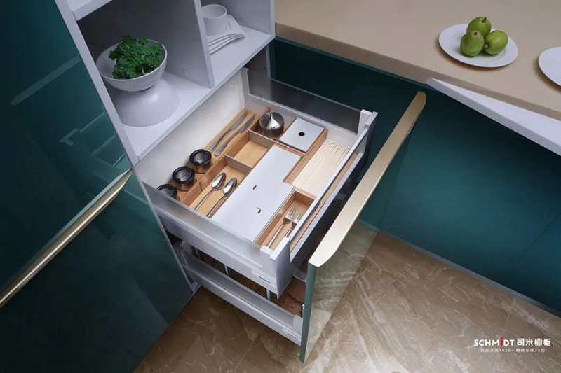 抽屜內部分布成多個區域,把餐具、廚具分類進行擺放,讓抽屜的利用率更高,取物更分明了。