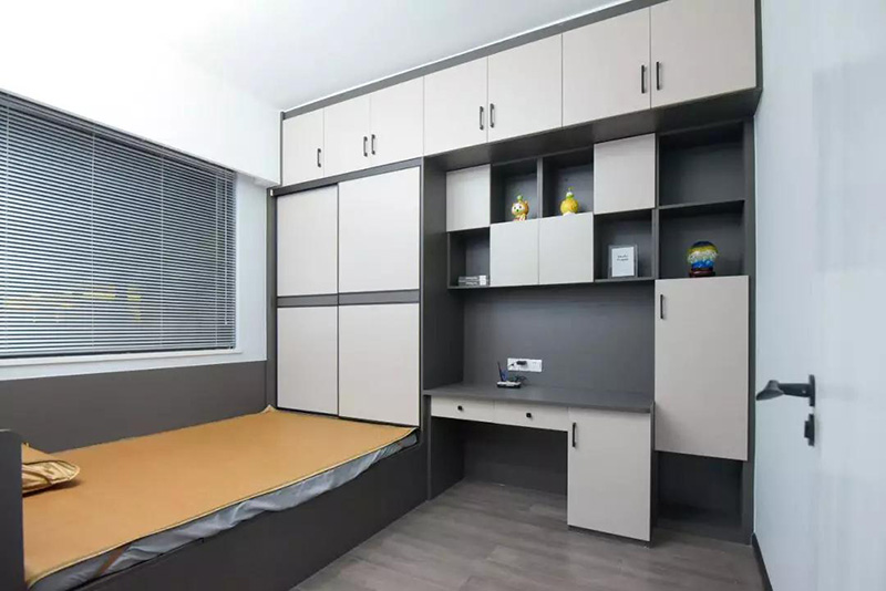 榻榻米+衣櫃+書櫃+書桌的組合適配此需求,它是書房、是臥室、是儲物間。用戶盡可以根據自己的生活狀態和需要,隨時切換它的功能。