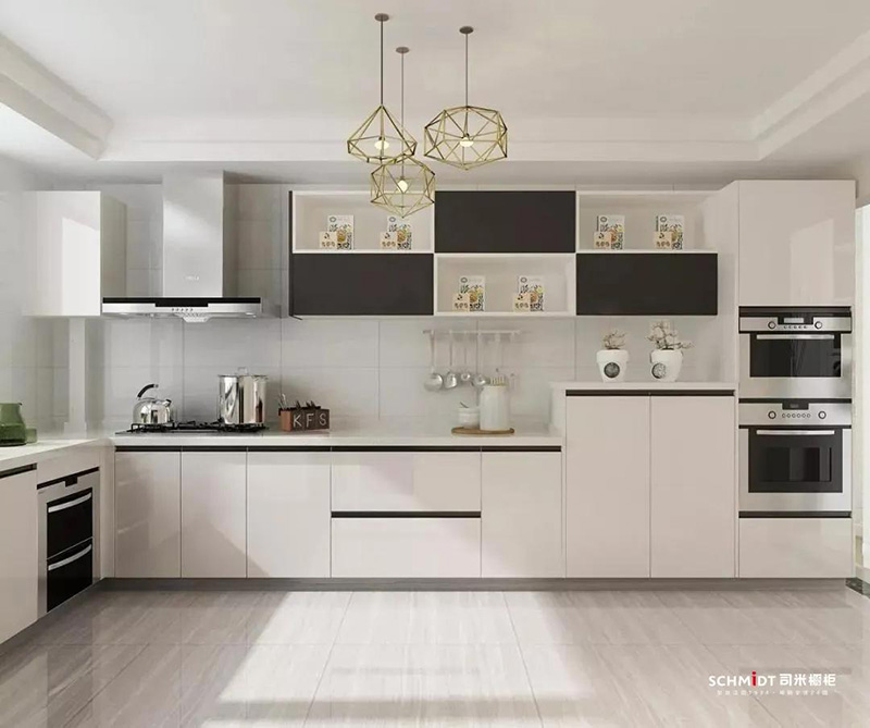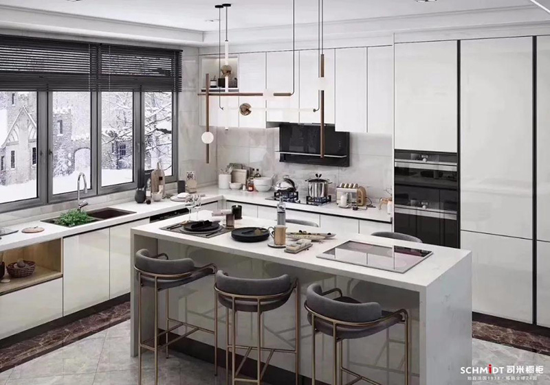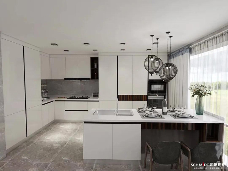 使用白色亮面的櫥櫃設計能讓廚房顯得更加通透明亮。烤漆或者亞克力等亮面板材就是不錯的選擇。