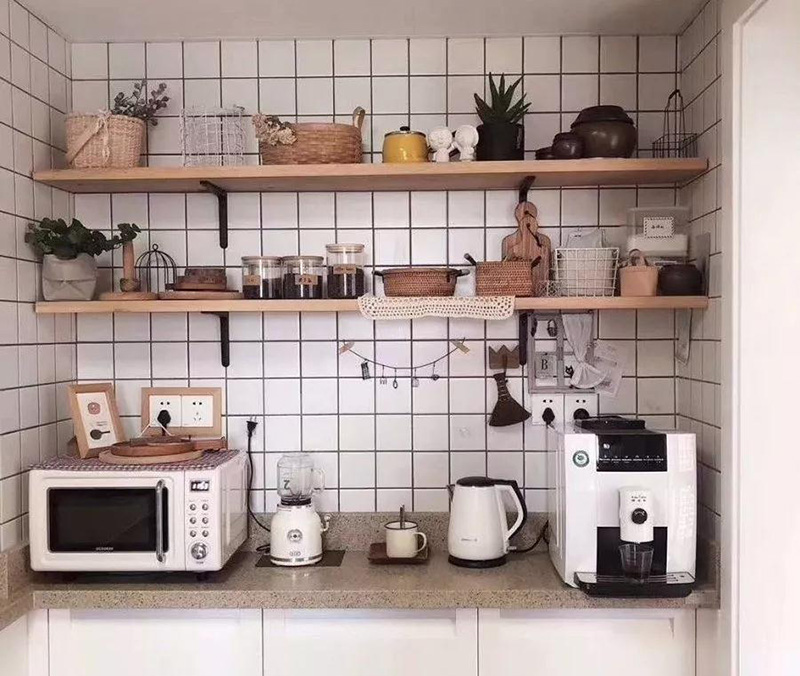 為了讓廚房擁有更多的收納功能,可以在墻壁上安置擱板。除了可以放置廚房里的瓶瓶罐罐,還可以統一容器,做為廚房裝飾性的一隅。