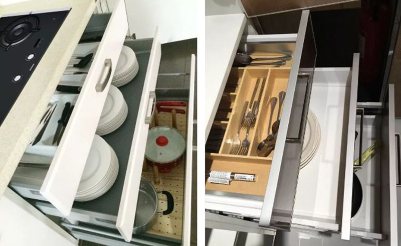 廚房里刀叉餐具也不好收納,在地櫃里設計一層抽屜分格,可以擺放好各種刀叉,既整潔又安全。
