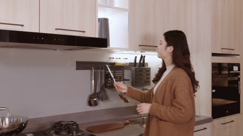 上方的吊櫃由于高度原因,拿取東西會比較不方便,可以在上吊櫃內部安裝吊櫃升降拉籃,拿取物品更輕松更加方便。