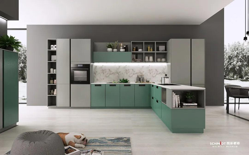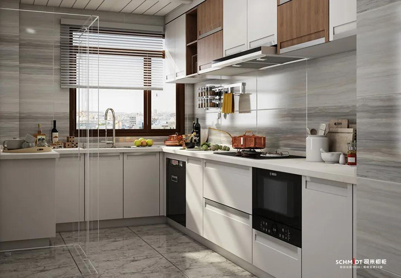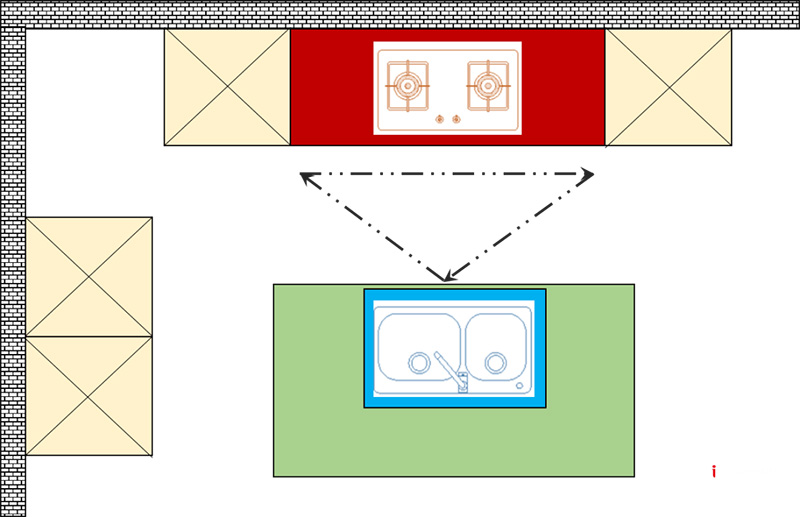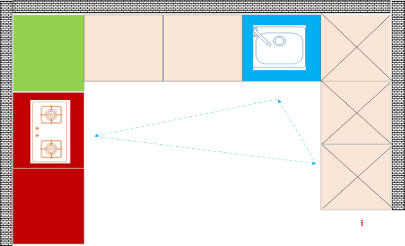 沿墻壁相鄰的兩邊,呈L型布置設備,一般情況下,L形櫥櫃的設計,會將操作臺與灶臺盡可能的分兩邊擺放。