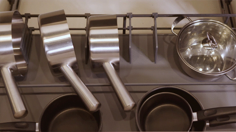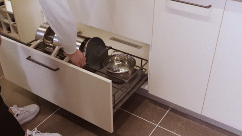 ▲鍋具拉籃,大而笨重的鍋具都能納入其中,保證廚房的整潔。