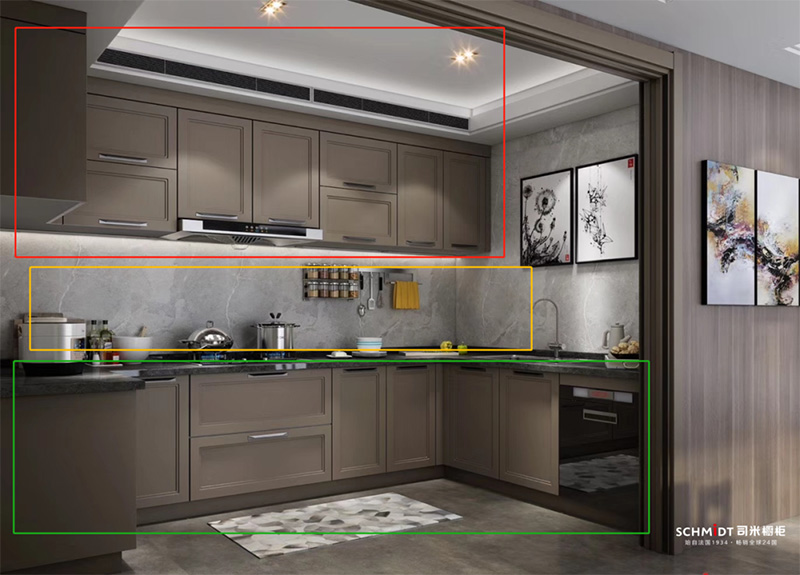 有輕即有重,廚房的碗碟、鍋具等大而重的物品適合放入地櫃中,因為地櫃的收納空間和承重能力都比較強。