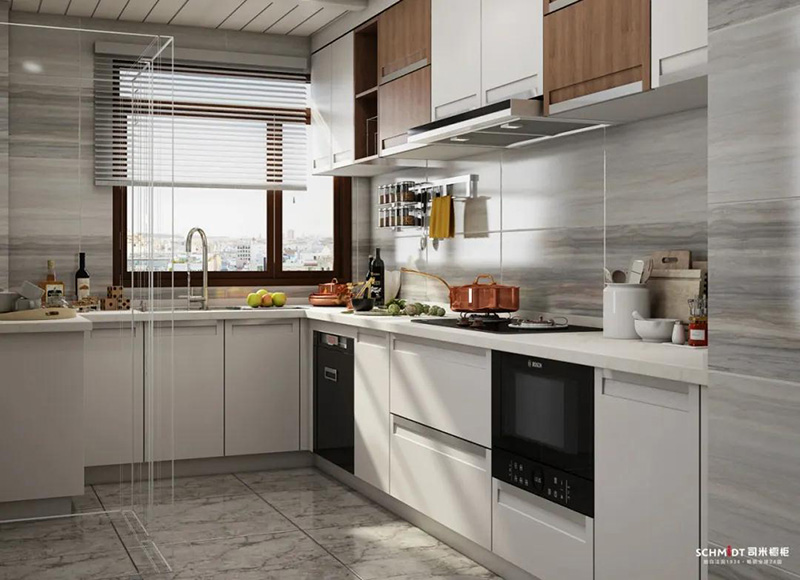 L型廚房非常適用于狹長的小戶型廚房,L型廚房布局是在兩條直線邊的功能上加了一個轉角,兩邊一長一短,在視覺上將空間拉伸。