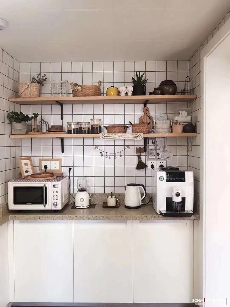 東西多,就把墻面利用起來,安裝擱板,把喜歡的食器做成系列陳列其上,還可以起到裝飾作用!但需要注意這里並不是你擺放雜物的地方哦~