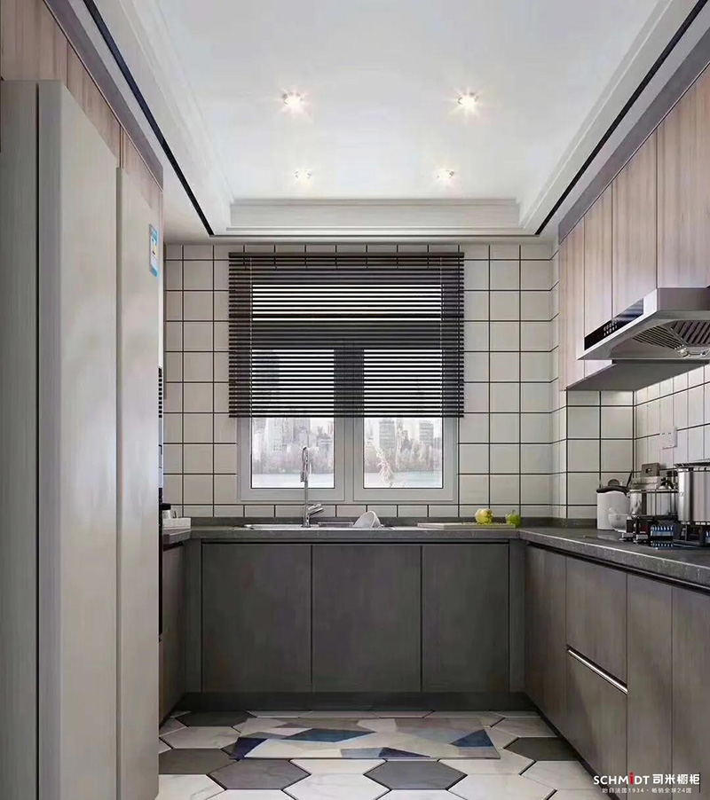 就算廚房小,也一樣能夠利用U型布局凹造型,提高空間利用率。U型廚房實際上是將L型廚房較短的一面拉伸,將水槽、工作臺、爐灶、冰箱沿墻排成U型,整體空間會非常大氣。