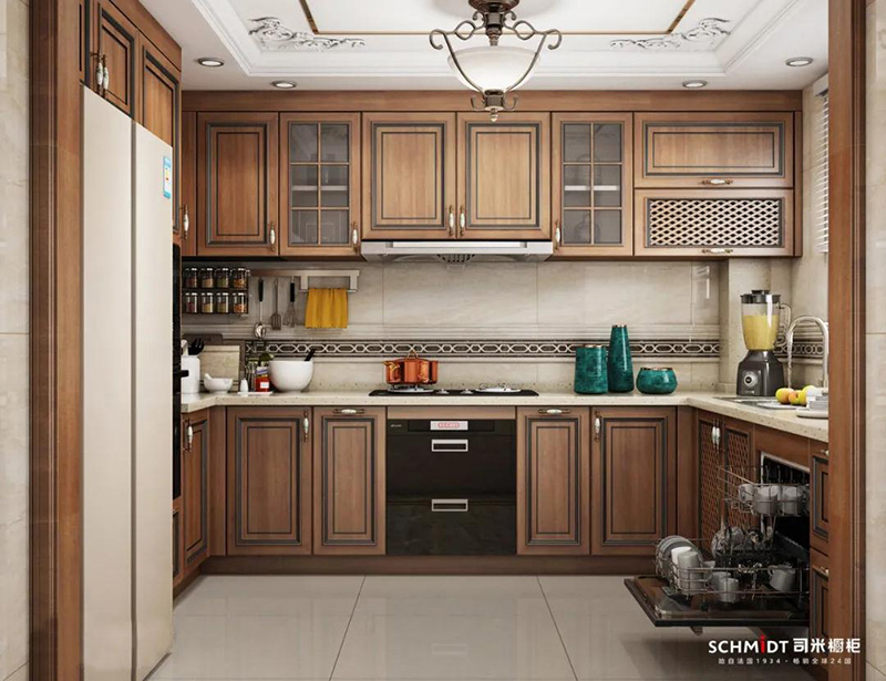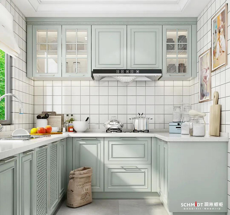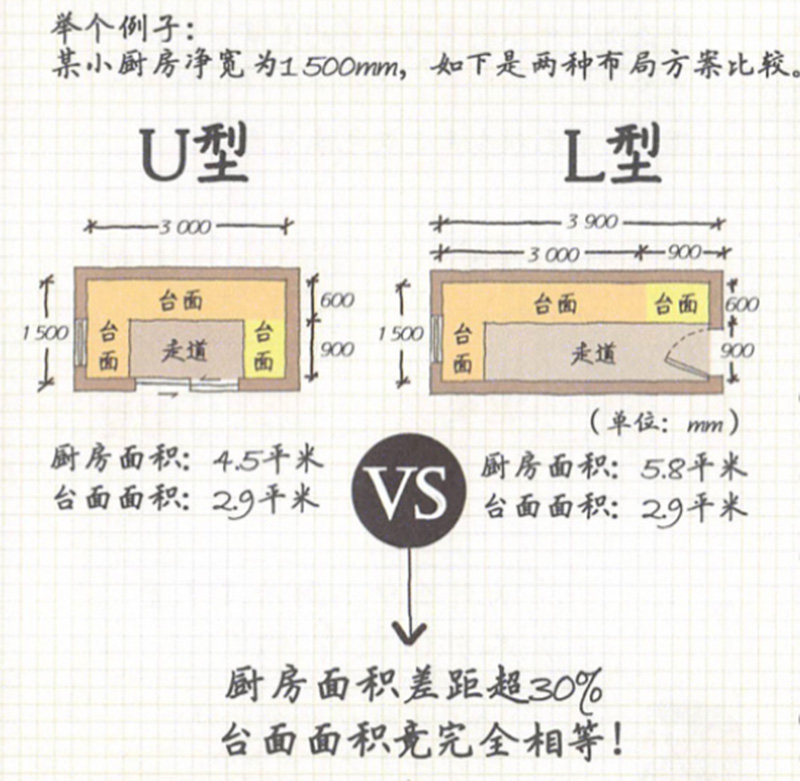 針對小型廚房,在臺面面積完全相等的情況下,U型廚房比L型廚房的核心優勢是高效節地。