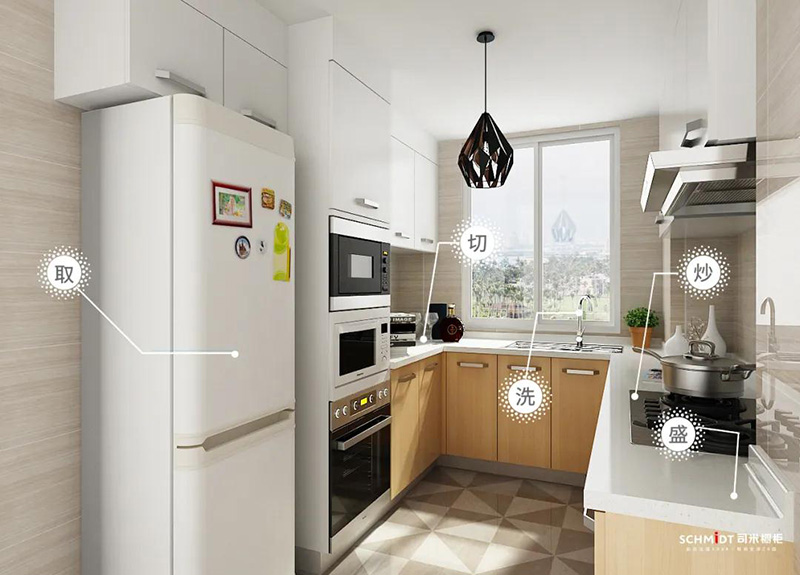 做飯一般都要經過五個步驟:取、洗、切、炒、盛,所以具備一個高效的廚房布局,做飯達到五步順暢高效、一氣呵成十分重要。