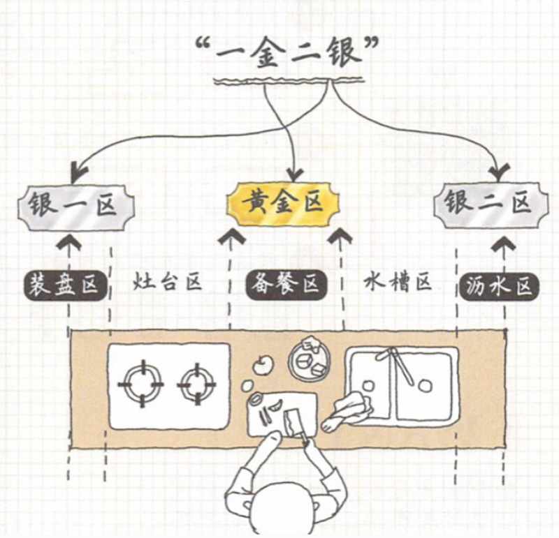 廚房臺面區域都會被分為三個區域:備餐區、裝盤區、瀝水區,可以一一對應為“一金二銀”。
