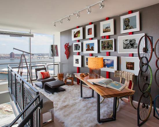 小編的話:這間書房無論是陳列的攝影作品,還是彩色車輪的隔斷,亦或是鏤空黑色圍欄都展示著主人的個性與創意。落地窗戶的設計讓外面的景色盡收眼底。